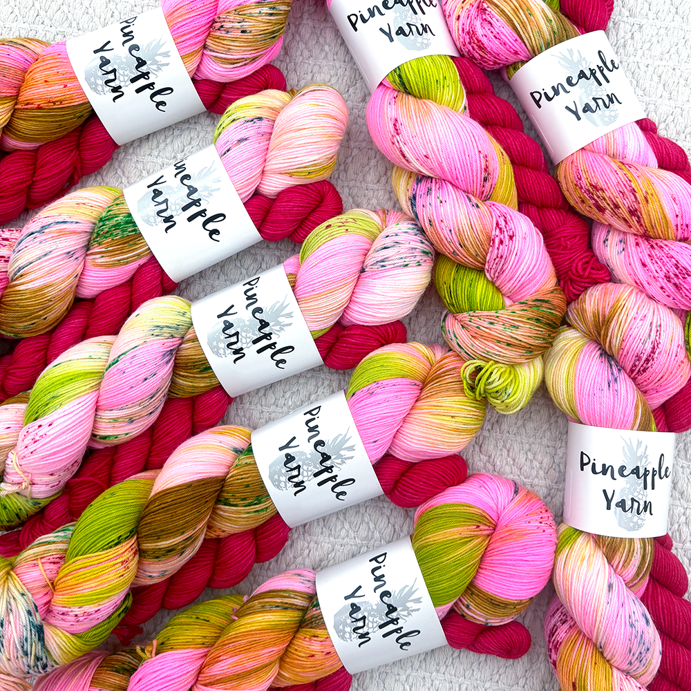 Bubblegum pink, bright green, and gold, with contrasting speckles thoughtfully placed throughout, and paired with a cheery red mini skein.
