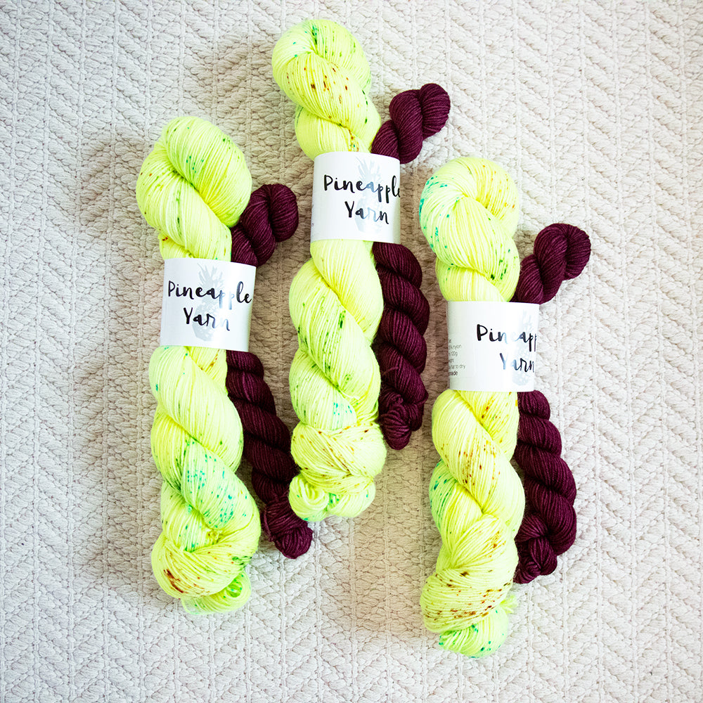 Bright neon yellow is accented with a smattering of contrasting delicate speckles. Paired with a deep wine mini skein.