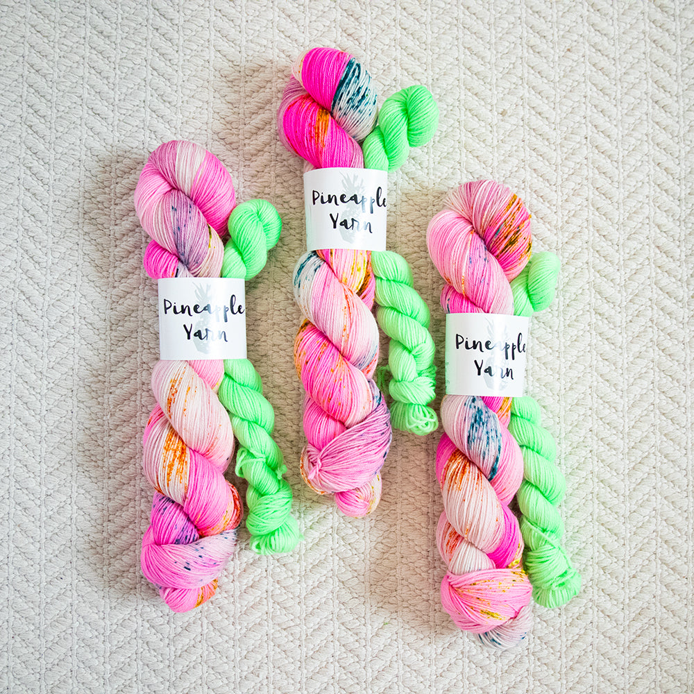 Various shades of pink, with contrasting speckles thoughtfully placed throughout. Paired with a bright green mini skein.